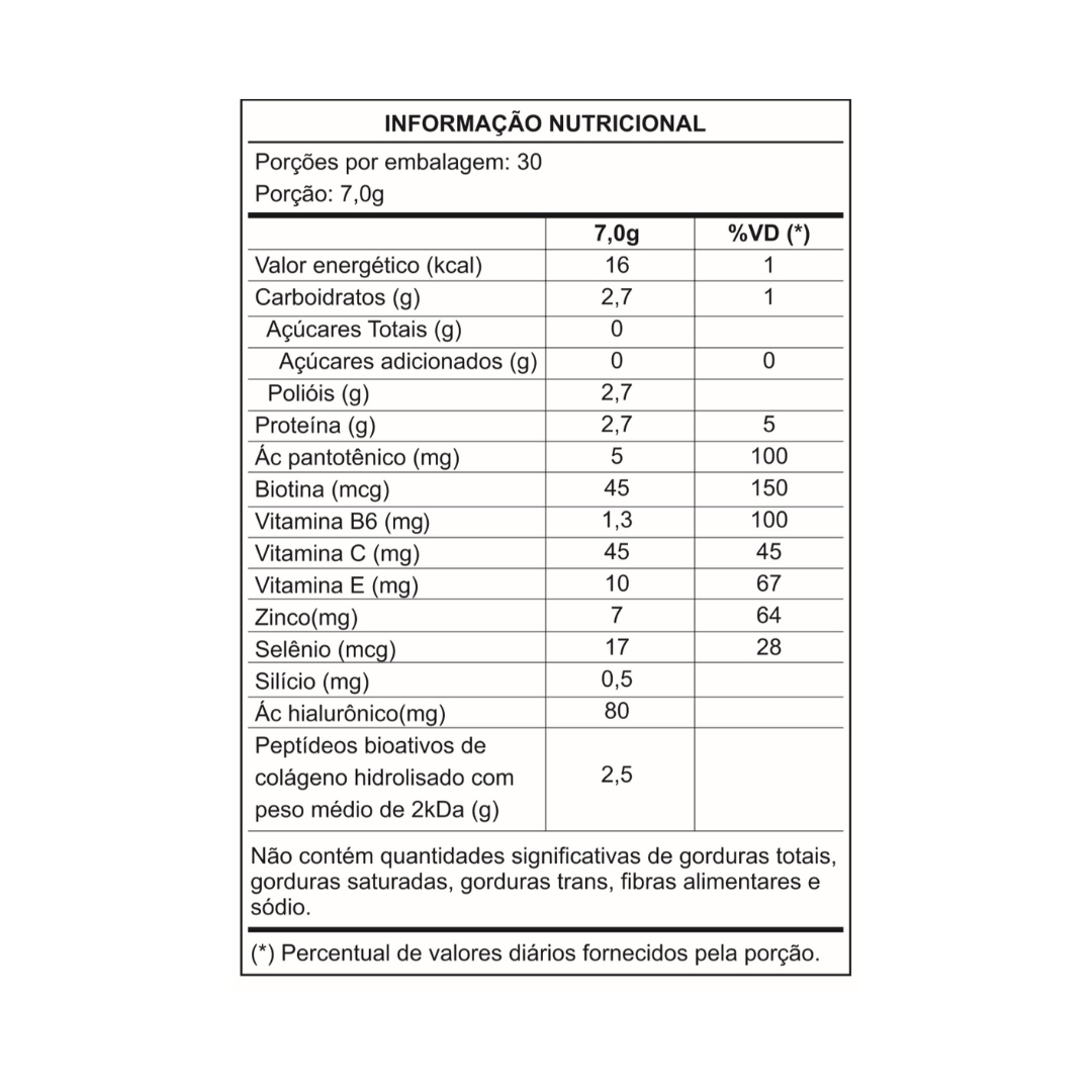 Este suplemento combina colágeno Verisol, ácido hialurônico, biotina, silício e vitaminas para fortalecer cabelos, unhas e pele. Proporciona firmeza, hidratação e elasticidade à pele, além de fortalecer os fios e reduzir a queda. As unhas ganham mais resistência e crescem saudáveis, enquanto a pele mantém um aspecto jovem e radiante.